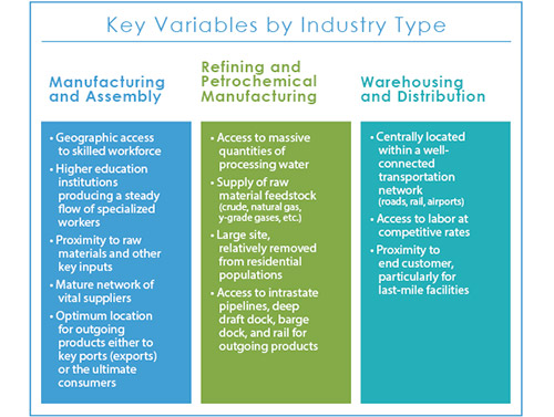 The cost of bringing in the right SMEs can pay dividends in returns over the lifespan of a successfully located project. Key success variables are not the same for any given project. It would be foolish to think that any site, even if certified and promoted heavily by an EDO, will be suitable for your project. Success lies in understanding which regions and sites match best with your immediate project needs and align with long-term company objectives. Key variables that ultimately make or break a project are sometimes not glaringly obvious and vary widely by industry and project type. Some of the key variables by industry type are listed in the accompanying chart.